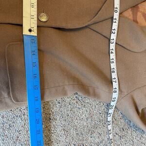 This vintage women's blazer from the 80s is a stylish and sophisticated addition to any wardrobe. Made from 100% wool with a polyester lining, it features a mid-length cut and long sleeves with a relaxed fit. The tan color is accented with gold buttons and the blazer is double-breasted for a classic look.