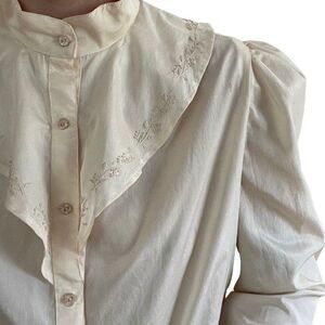 Vintage 80s Womens 100% Silk White Ruffle Collar Floral Light Academia Blouse