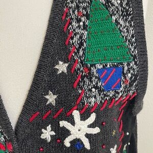 Vintage 80s Womens Christmas V-Neck Button Front Sweater Cardi Vest Black and White Embellished Petite