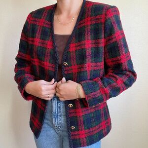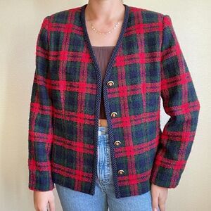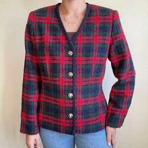 Vintage 80s Womens Lord Taylor Christmas Theme Plaid Red Green Cropped Blazer
