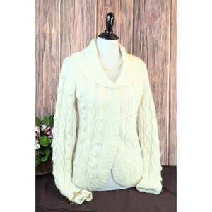 Wrap yourself in luxury with this vintage 1980s women’s cowl neck popcorn knit cardigan. Crafted from a blend of soft angora rabbit hair and lamb's wool, this off-white pearl hue sweater combines warmth and style in an ultra-cozy design. The unique popcorn knit and classic cable detailing give it a beautifully textured look, while the cowl neck collar adds a chic, relaxed feel. Perfect for layering, this size small cardigan is a timeless wardrobe staple for lovers of vintage fashion and luxurious materials.