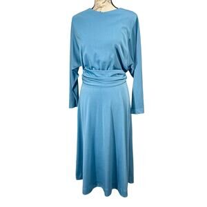 Step back in time with this stunning vintage 80s Claralura dress! This baby blue satin sheath dress features a flattering A-line silhouette, dolman long sleeves, and a unique open back with a sash tie.