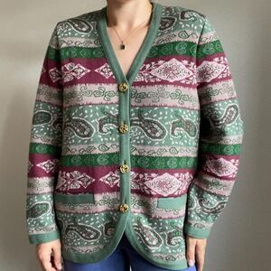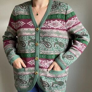 Vintage 80s Womens Pink Green Paisley Striped Oversized Grandma Cardigan Sz L