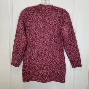 Raspberry Red and white marled vintage (80's) 100% Bouclet Wool cardigan sweater by Kas Brand. Vintage sizing - fits closer to a medium than a true size large (check measurements to be sure). Features two front patch pockets. Excellent pre-owned condition. Bust across the front area measures approx. 18.5 inches (unstretched). Length of the cardigan measures approx. 26.5 inches.