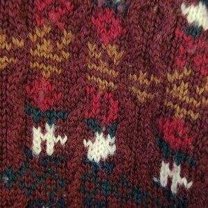 Vintage 80s Wool Collared Cable Knit Sweater Regatta Sport, Size M. Unisex, Pit to pit 23", Shoulder to hem 27", 3 Leather Covered Button Closure, Unique Woven Print, Made in Hong Kong, Shades of Burgundy. Some Pilling From Age. Good Pre-Owned Condition