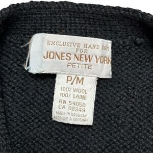 Hand-knit in Uruguay for Jones New York, this 1980s wool cardigan blends romantic cottagecore and subtle gothic elements. Deep black wool is accented by vivid red roses and ivory leaves, knit in a striking border motif across the front, cuffs, and hem. Features a soft V-neck, button front, and slightly cropped silhouette. A beautifully made piece that pairs as easily with vintage denim or a maxi skirt. 100% wool.