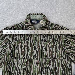 Men's Vintage 1980s Woolrich 100% Pure Wool Made in the USA Button Up Long Sleeve Pointed Collar Front Chest Pockets Tree Bark Camouflage Camo Hunting Shirt .