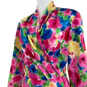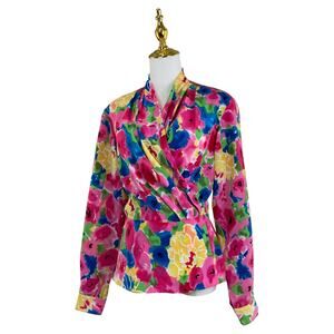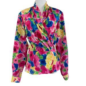 Vintage 80s Working Girl Evan Picone Pink Floral Peplum Wrap Blouse Size 10