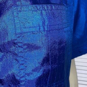 100% polyester, V-neck button-down waist lightweight swishy top. Bold shoulder, pads, easily removed. Front open pockets. Slouchy fit. Gold lion engraved buttons. Excellent vintage condition. Women’s size 14 medium.