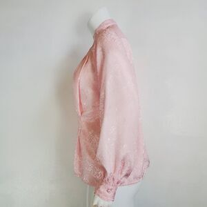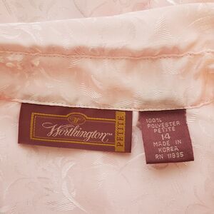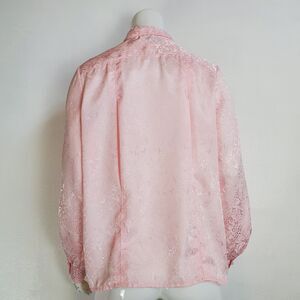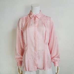 Vintage 80's Worthington pink floral button-up long-sleeved blouse with collar, front-pleating, and hidden buttons.