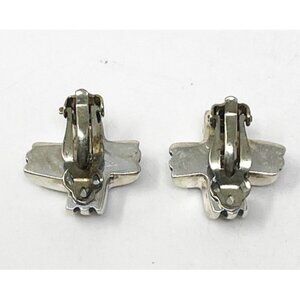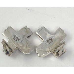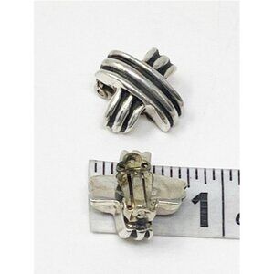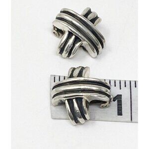 These bold sterling silver earrings by Zina feature a striking crisscross or knot motif with oxidized channels and high-polish silver ridges. Crafted in 925 sterling silver and marked accordingly, they offer a timeless and sculptural look. Comfortable clip-on backs make them perfect for non-pierced ears. A distinctive pair ideal for fans of modernist or southwestern design.
