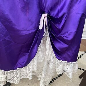 Vintage 80s Zum Zum grape royal purple, Little Bo Peep style prom dress with white and lavender lease details and bows. Back zip closure. Wear off shoulder or on. Back zip and underneath crinoline for a little oomph. You could add more if you want to go for a real southern bill look. Perfect for costumes, Disney, princess, prom, coquette or goth aesthetic. No size tag or fabric content tag that I see but it is featured on my size medium dress form where it fits well. Laying flat measures approximately 55 inches shoulder to him, 15 inches straight across the waist and 18 inches armpit to armpit. There is some light discoloration to the satin underneath the arms. It’s worth mentioning, but not obvious, it looks more iridescent.