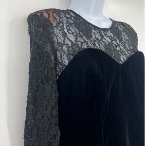 Zum Zum, Niki Livas, vintage Zum Zum, black velvet dress, lace illusion neckline, sweetheart bodice, long sleeve lace dress, goth party dress, 80s prom dress, 90s cocktail dress, whimsigoth, witchy, vampy, gothic glam, vintage made in USA, Y2K