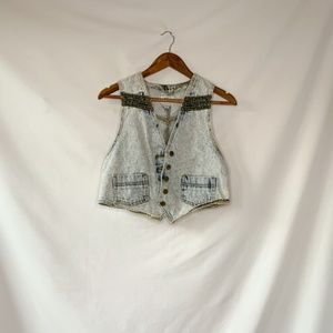 Vintage white acid wash denim fitted mini vest with front pockets and patchwork on the front. Metal button down front. 100% cotton