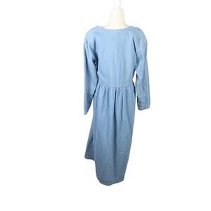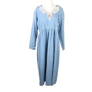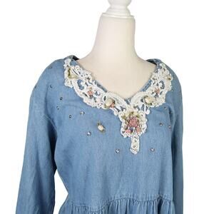 Vintage 80s blue denim cream crochet lace embellished midi dress M