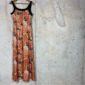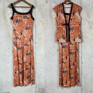 Vintage 80s burnt orange beige black zoo animal tribal maxi dress set medium
