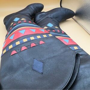 Design: The boots are knee-high and made of black leather, featuring vibrant geometric cut-out patterns in colors like red, navy blue, light blue, and mustard yellow.