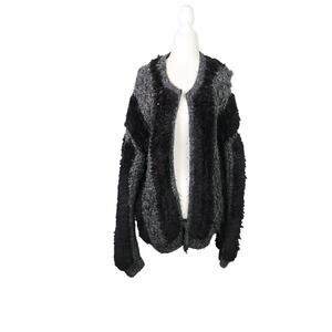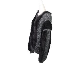 Vintage 80s grey and fuzzy black knit stripe cardigan sweater L