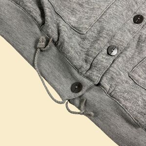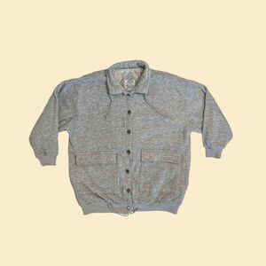 Vintage sweatshirt, manufactured ca. 1980s by Be in the Current Seen. Button-down style in medium thickness grey with side and front pockets. One size fits all.
