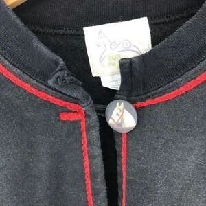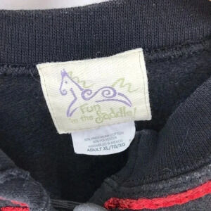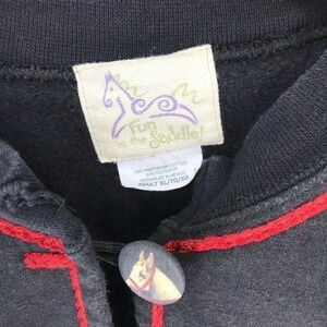 Black with red trim and the most fabulous horse face buttons, with elastic loops to close them. Fun in the Saddle brand. Great used condition, no flaws. For the 80s equestrian in your life.