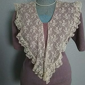 Beautiful purple vintage 80's sweater with delicate lace detail by Russ. Says size small but can fit small to medium. Bust about 18.5" and from shoulder to hem about 25" long. You can wear this sweater w jeans or dress it up w a skirt.. Perfect time of year for it too! Perfect condition ❤