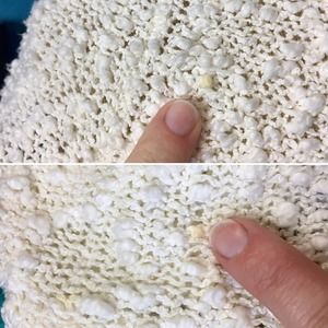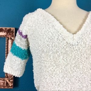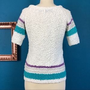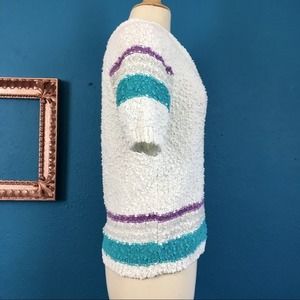 Vintage 80’s sweater top. V-neck, short sleeve, slight open weave w/ popcorn texture. White w/teal, purple, & grey/taupe stripes. 2 small spots in weave have a slight yellow color, but I think this is from the natural cotton used. So cute with high waisted jeans or cut offs- perfect for transitioning seasons. Marked M, dress form is a 6/8.