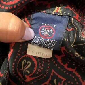 Cute button down blouselong sleevesclassic styleblack and red floral patternfall vibesBrand: Pins and needlesSize: 6 petiteFabric content: polyesterGreat vintage condition, no defects All approximate measurements are taken while lying flat Double when measuring Bust - 18.75"Waist - 18.25"Length - 24"Shoulders - 14.5"Sleeve - 21.5"