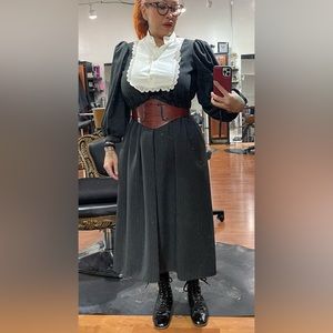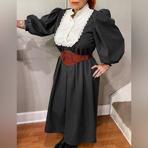 This is a vintage 80’s dress that I believe is a maids uniform. It has a very uniform feel to it. It is machine washable, and not fragile at all. It is pinstriped it has an elastic waist. It has buttons on the bib with the lace trim. It is union made in the USA. Which probably explains the quality. In modern sizing it would be about a 13/14 or a size large or X-large.