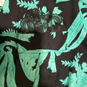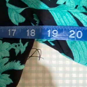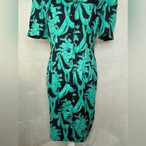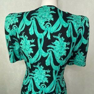 Vintage 80s petite, jazz ladies button front formfitting dress puff sleeves with shoulder pads, black and turquoise floral pattern