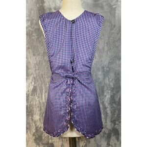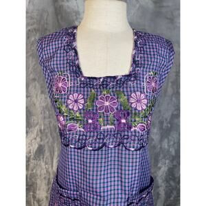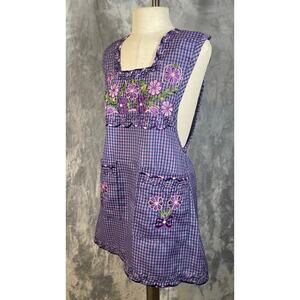Super cute vintage pinafore apron tunic top. Sleeveless, square neckline, two front patch pockets. Buttons up back with tie at waist. No maker or content but there is a size 36 tag. Purple plaid and purple embroidery. Excellent condition.