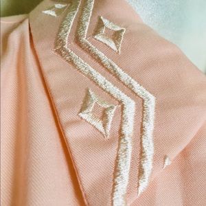 Amazing vintage padded shoulder pink shirt with gold over collar that has a sewn zigzag and diamond shapes large fabric buttons, button down front and designs embroidered on the pocket also. Long sleeves and button closure. This is perfect like new condition! Vintage size 12 best fits a size large. 42” chest 26” long. Brand is Bedford fair polyester rayon blend. A-10