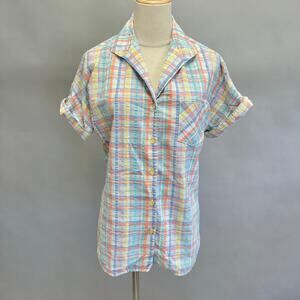 Vintage 80s plaid pastel seersucker roll short sleeve button up top small/medium