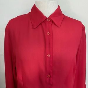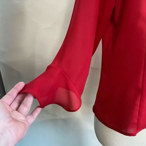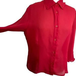 Vintage 80s Eva Laurel red button front ruffle sleeve blouse. Flowy & sheer (would need a camisole underneath or just a pretty bra if you're bold). Classic look with a little whimsy with the ruffle cuffs. 3/4 length sleeves, seaming at the front & back for a flattering fit. Marked a 14 but vintage sizing varies from modern and may fit a modern 10/12 or larger medium/smaller large best- see measurements for a good fit. Measures (flat, unstretched, approximate): armpit to armpit: 21in, waist: 18.5in, hip: 19in, shoulder to hem: 23.5in, sleeve: 19in