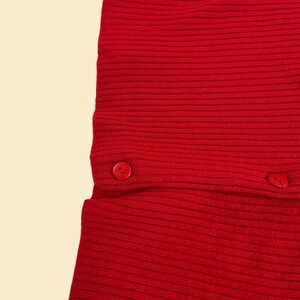 Vintage button-up sweater, manufactured ca. 1970s-1980s by Spanner Imports. Long fitting sweater with ribbed trim on the bottom 1/3rd, three front pockets, and shoulder pads. Size L (fits long) in red color.
