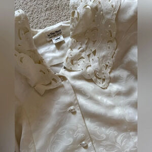 Button up top with shoulder pads and matching skirt. Says size 14 but fits more like a 6, seems like bridal sizing. Would be great for a bridal event!