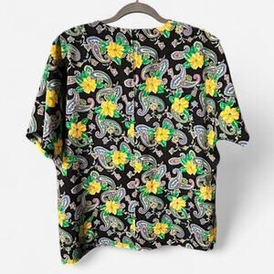 Vintage 80s smooth silky blouse with yellow hibiscus flowers and paisley design - blue, white, green, purple, yellow. Shoulder pads removed. Excellent condition.