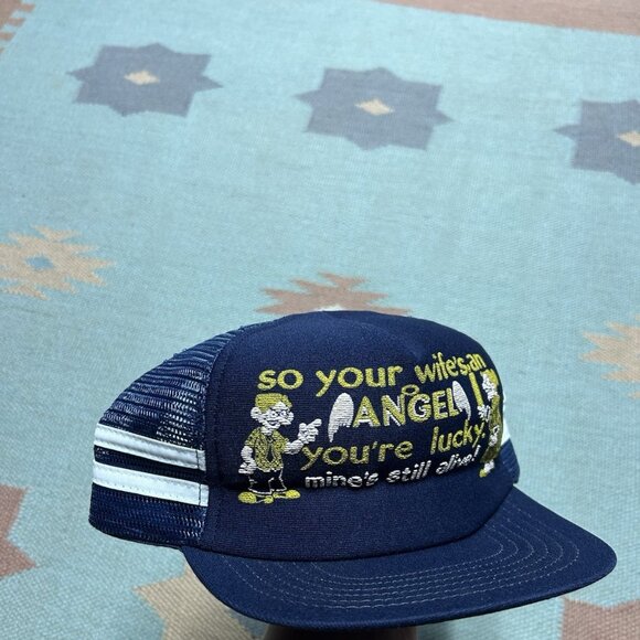 Vintage 80s trucker hat mesh cap 2 stripe your wife’s an angel mine’s dead funny