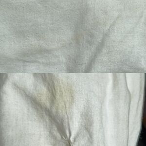 Has some yellowish in the fabric, sleeves, front and the back, neckline area see photos just need some professional cleaner.