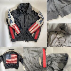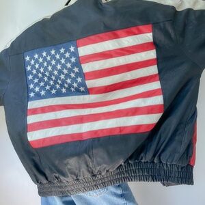 Stunning vintage one-of-a-kind genuine leather jacket! Super warm and HEAVY, this jacket feels like wearing a warm weighted blanket. Featuring a rich and structured leather material, 2 front slit pockets, an inside pocket, an all-over USA flag graphic, and a collar!