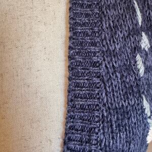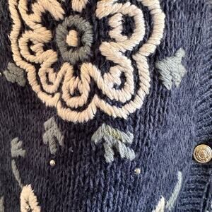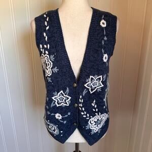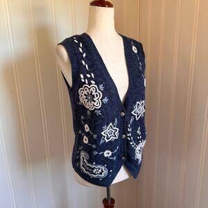 This vintage 80s/90s Lord Isaacs knit sweater vest is a size small. This blue vest has a white and blue floral/paisley pattern. It has beaded accents and silver tone buttons down the front. It's a ramie/cotton blend and hand wash. This vest has twee vibes and is in good vintage condition.