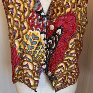 This vintage 80s/90s Surya vest is a size large. This blue beaded vest has a yellow, red, white, and blue pattern. It has buttons down the front. It's rayon and hand wash. This vest has boho vibes and is in good vintage condition.