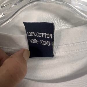 Rare vintage souvenir-style T-shirt featuring a bold embroidered dragon design with “Hong Kong” lettering in both English and Chinese (香港). Crafted from 100% heavyweight cotton and made in Hong Kong — a telltale sign of late 1980s to early 1990s manufacturing, prior to the 1997 transition period.