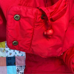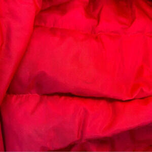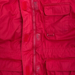 Vintage 80s/90s Eddie Bauer red 100% goose down fill hooded puffer jacket/coat/parka. Snowline style, full zip up and velcro front closures. Six front pockets, three velcro, two open (on the sides of two largest velcro pockets), one zipper. Inner pocket with two compartments, velcro and zipper closures. Removable hood with drawstrings, zips on/off. Snaps at the collar. Inner drawstrings at the waist for a more cinched in look. Velcro at cuffs for adjustability. Minor fading throughout garment, a few very feint black marks. Velcro is clean as I have pre washed, but has some loose threads still stuck inside. Does not impact functionality, and cannot be seen when fastened. See photos and video for examples of wear. Size women's small.