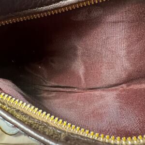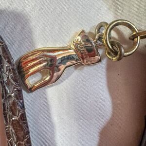 The stand-out feature is the distinctive, polished gold-tone metal zipper pull in the shape of a clenched hand, which is both quirky and instantly recognizable to collectors of late-century novelty hardware. The interior is lined with a coordinating brown/maroon fabric and includes a zippered closure for security. The thin, matching shoulder strap allows it to be worn comfortably on the shoulder or as a crossbody (depending on your size). This bag captures the essence of 80s and 90s maximalist style while maintaining a chic, structured look.