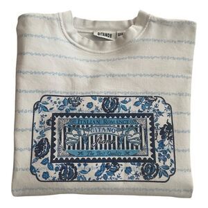 Vintage 80s-90s Gitano Floral Stripe Pullover in white. Features a light blue floral stripe throughout with Gitano Jeans graphic on the front “Italian Romance” & “The Best Quality.” Crew neckline & long sleeves with ribbed cuffs. Lovely piece. In very good preloved condition with minimal normal wear consistent with vintage age. Size small. Approximate measurements lying flat: 20” from pit to pit & 26” from shoulder to hem. I welcome offers! I will accept or counter. Please note, if you are prompted with a minimum amount when trying to send me an offer, disregard that & message me your offer instead. I will gladly consider it!
