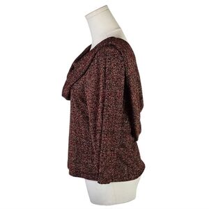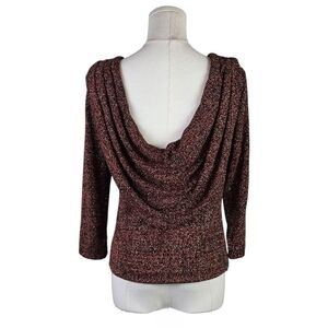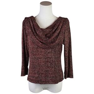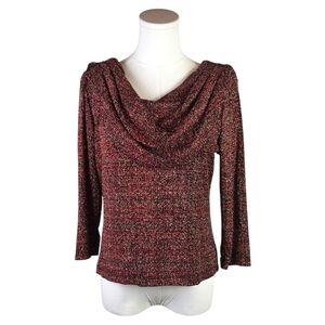 Step into timeless elegance with this vintage 80s/90s J.B.S. Ltd. draped cowl neck top, crafted in the USA and designed to turn heads. This beautifully textured knit blouse features a rich burgundy, black, and metallic thread blend that creates a luxurious tweed-like finish. Both the front and back feature dramatic cowl necklines, adding instant sophistication and flair.
