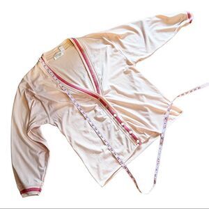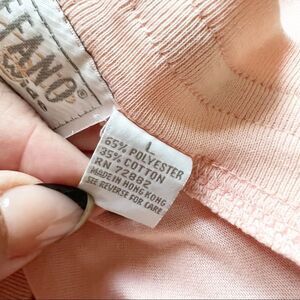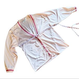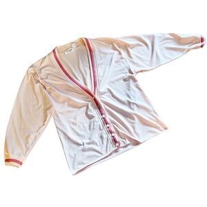 Vintage 80’s 90’s Lightweight Pink Cardigan Stefano World Wide. Size large. Polyester cotton blend. Made in Hong Kong. Soft pink baby pink/salmon pink. Darker pink stripe trim. Pretty light pink buttons that shift in the light. Approximate measurements: Bust 21” Length 27.5”