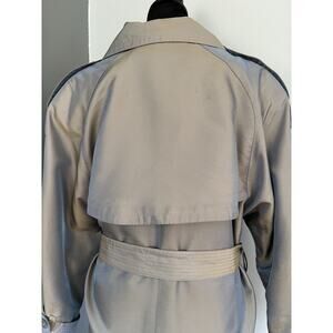 This vintage 80s 90s London Fog trench coat in iridescent blue-gray is a stylish and versatile piece perfect for various occasions. With a wool blend REMOVABLE lining, this long coat features a relaxed fit with long sleeves, a tie and button closure. The classic trench coat style is accented with shoulder pads, pockets, and is water resistant, making it ideal for winter, fall, and spring seasons. Perfect for travel, casual outings, workwear, or business meetings, this designer coat exudes a timeless London charm with a touch of 80s and 90s flair.