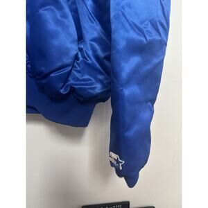 This Vintage 80s NFL New York Giants Starter Satin Jacket in size XL is an officially licensed fan apparel item for men. Made in the United States, this blue jacket features the iconic colors and logo of the New York Giants, making it a perfect addition to any football fan's collection. The jacket is perfect for wearing during the regular NFL season and is a must-have for any die-hard Giants supporter looking to show their team pride in style.