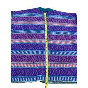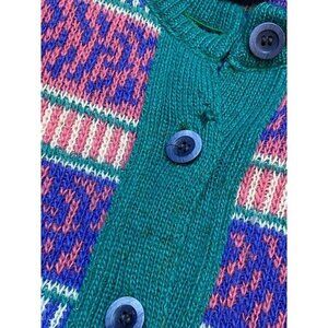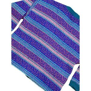 A vibrant vintage cardigan featuring a multi-color stripe and tribal pattern. Made from cozy wool, this button-up sweater combines style with warmth.